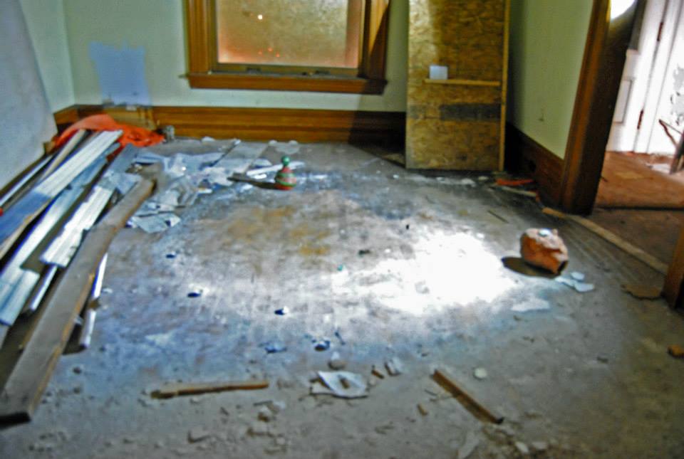 A large pile of branches was heaped in the entryway, like the house was protected from intruders like us. We were hushed as we made our way through, taking pictures as we went. It felt a bit like we were being watched. I kept hearing faint noises from the floor above me. My friend didn’t hear it. The windows were all boarded up, so light was more limited than it had been in the hotel, so we were only able to see what was directly in the path of our headlamps. The majority of the house had been vacated, so there wasn’t much to see in the first few rooms. Then our light beams landed on something.