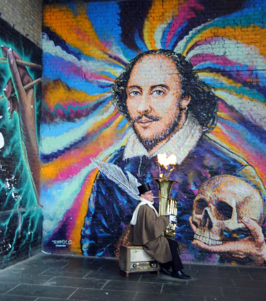 Tucked behind the National Gallery is Leicester Square, and further back the Chinatown Gates. Somewhere near Chinatown we got back on the Tube to Monument Station to see the Monument to the Great Fire of London. It still blows my mind that as far back as the 1600s, people were creating monuments to commemorate historic events. The instinct to preserve human experience is timeless, but the creation of monuments still feels like a much more contemporary action to me! We crossed over London Bridge (truly not an exciting landmark, if you can call it that) with a view of Tower Bridge further down the Thames. From there we walked to Shakespeare’s Globe Theatre. Just around the corner from The Globe is a beautiful piece of street art with a street performer: a tuba player who has fire coming out of his tuba. I saw him on other people’s posts of the street art, so he must be a regular in that particular location!